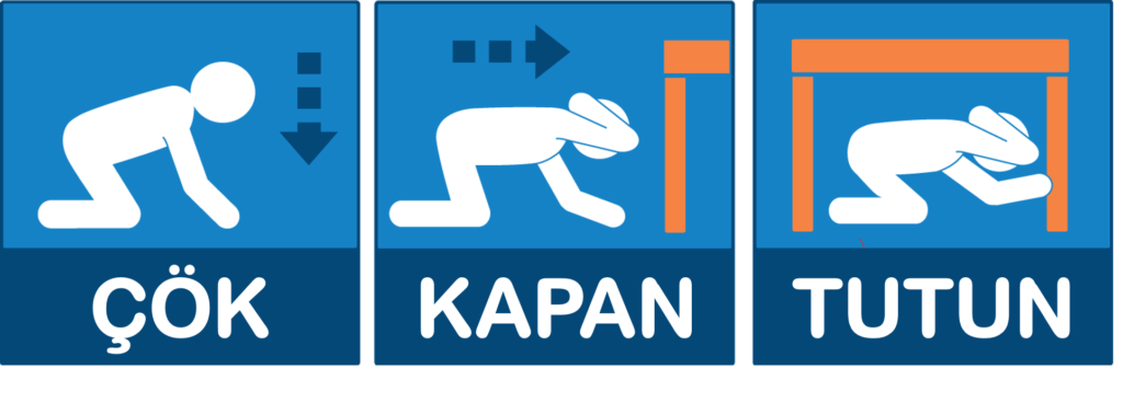 - Masa, mutfak tezgahı, çamaşır makinesi, yatak, küvet gibi sağlam olduğunu düşündüğünüz eşyaların yanına diz çökerek, ellerinizle başınızı koruyacak şekilde durunuz.(ÇÖK-KAPAN-TUTUN)