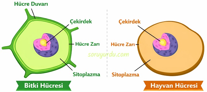 - Hayvan hücresinde sadece hücre zarı varken, bitki hücresinde hücre zarının hemen üst kısmında yer alan hücre duvarı bulunur.