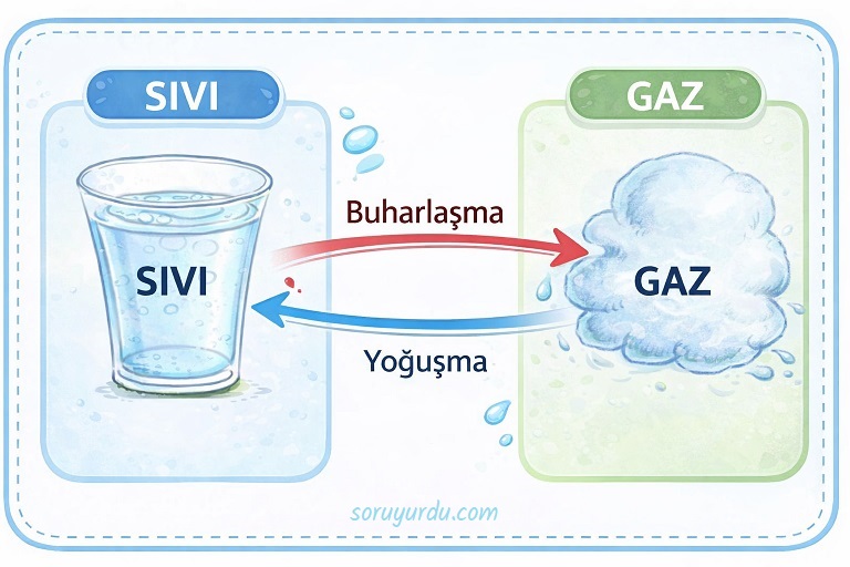 Yoğuşma: Gaz haldeki maddenin çevresine ısı vererek sıvı hale geçmesine denir. Yoğuşma sırasında madde dışarıya ısı verdiği için ortamın sıcaklığı artar. Yoğuşma sırasında saf maddelerin sıcaklığı değişmez.