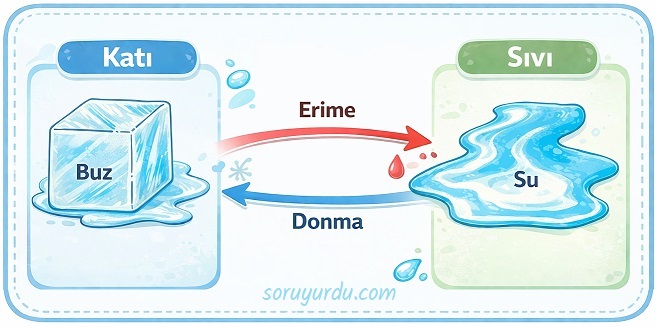 Erime: Katı haldeki maddenin çevresinden ısı alarak sıvı hale geçmesine denir. Erime sırasında madde dışarıdan ısı aldığı için ortamın sıcaklığı azalır. Erime sırasında saf maddelerin sıcaklığı değişmez.