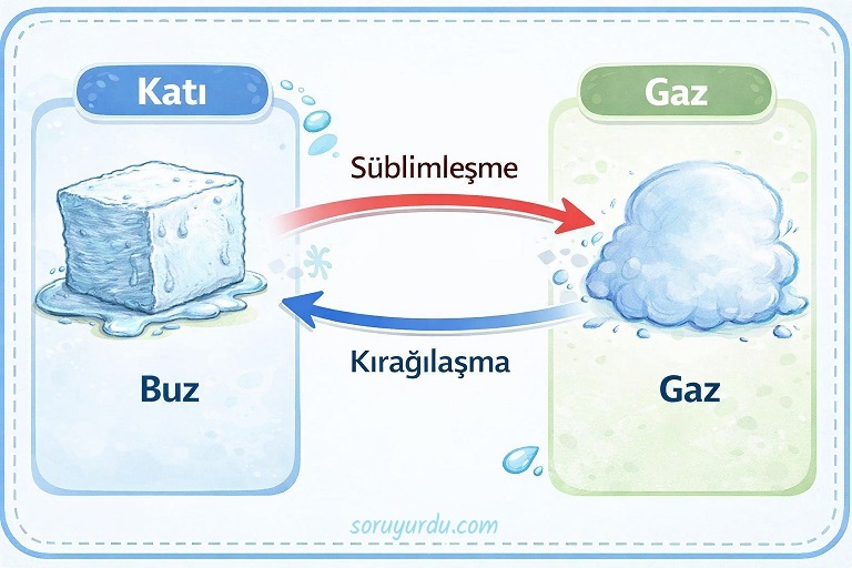 Süblimleşme: Katı haldeki maddenin çevresinden ısı alarak sıvı hale geçmeden direkt gaz hale geçmesine denir. Süblimleşme sırasında madde dışarıdan ısı aldığı için ortamın sıcaklığı azalır.