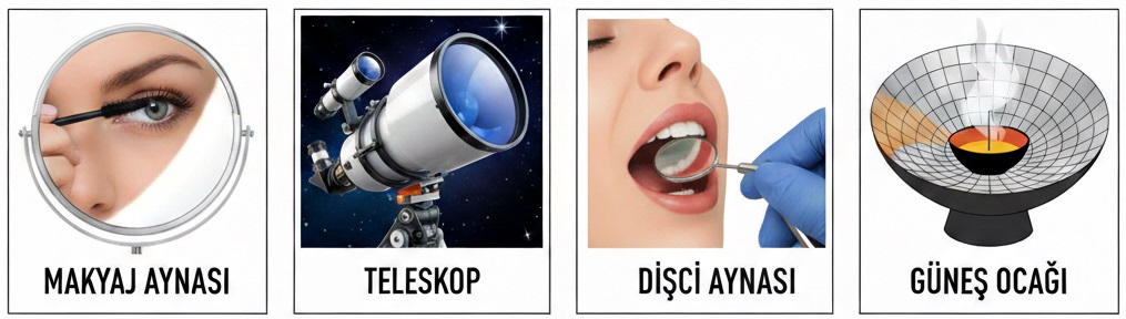 - Çukur aynalar günlük hayatta makyaj aynalarında, otomobil farlarında, pilli fenerlerde, ışıldaklarda, teleskoplarda ve dişçilerin kullandığı aletlerde, güneş ocaklarında kullanırız.
