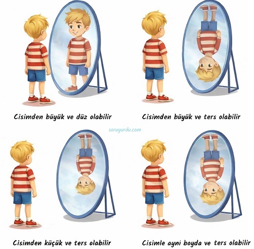 - Çukur aynada görüntü; cisimden büyük ve düz olabilir, cisimden büyük ve ters olabilir, cisimden küçük ve ters olabilir, cisimle aynı boyda ve ters olabilir.
