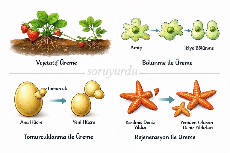 Rejenerasyonla üreme: Bazı canlılarda ana canlıdan kopan parçanın eksik kısımlarını tamamlayarak yeni canlı oluşturmasına denir. Denizyıldızı, planarya (yassı solucan), sülük ve toprak solucanlarında görülen bir çoğalma şeklidir.