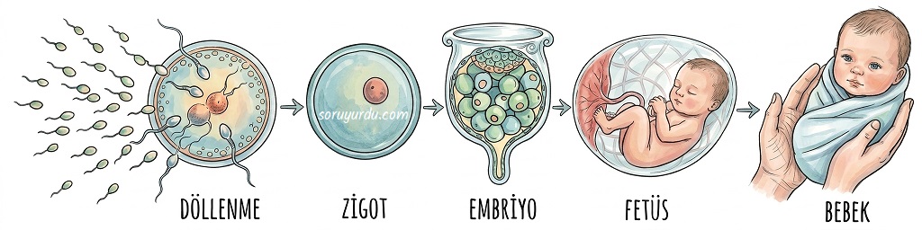 Yumurta ile sperm, dişinin yumurta kanalında birleşerek döllenme olayını sağlar. Döllenmiş yumurtaya zigot denir. Zigotun gelişmesi sonucu embriyo oluşur. Fetüs embriyonun ikinci aydan sonraki adıdır. Daha sonra bebek gelişir ve dünyaya gelir.