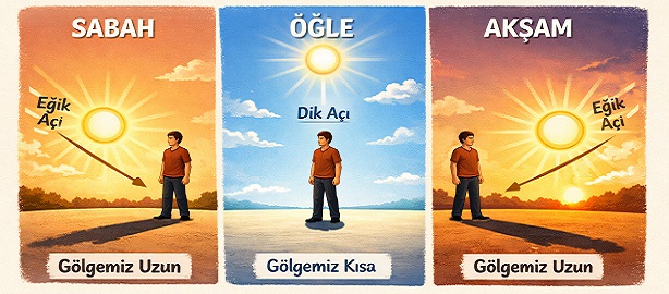 - Sabah ve akşam vakitlerinde gölge boyumuzun uzun olması, öğlen vakitlerinde gölgemizin kısa olması ışığın geliş açısına göre gölge boyumuzun değiştiğini gösterir.