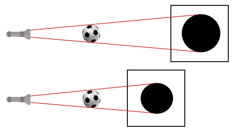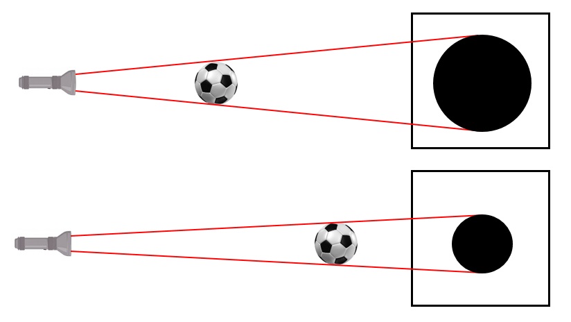 Cismin ve ışık kaynağının konumunu değiştirmeden; perdeyi engelden uzaklaştırırsak tam gölgenin boyu büyür, perdeyi engele yaklaştırırsak tam gölgenin boyu büyür.